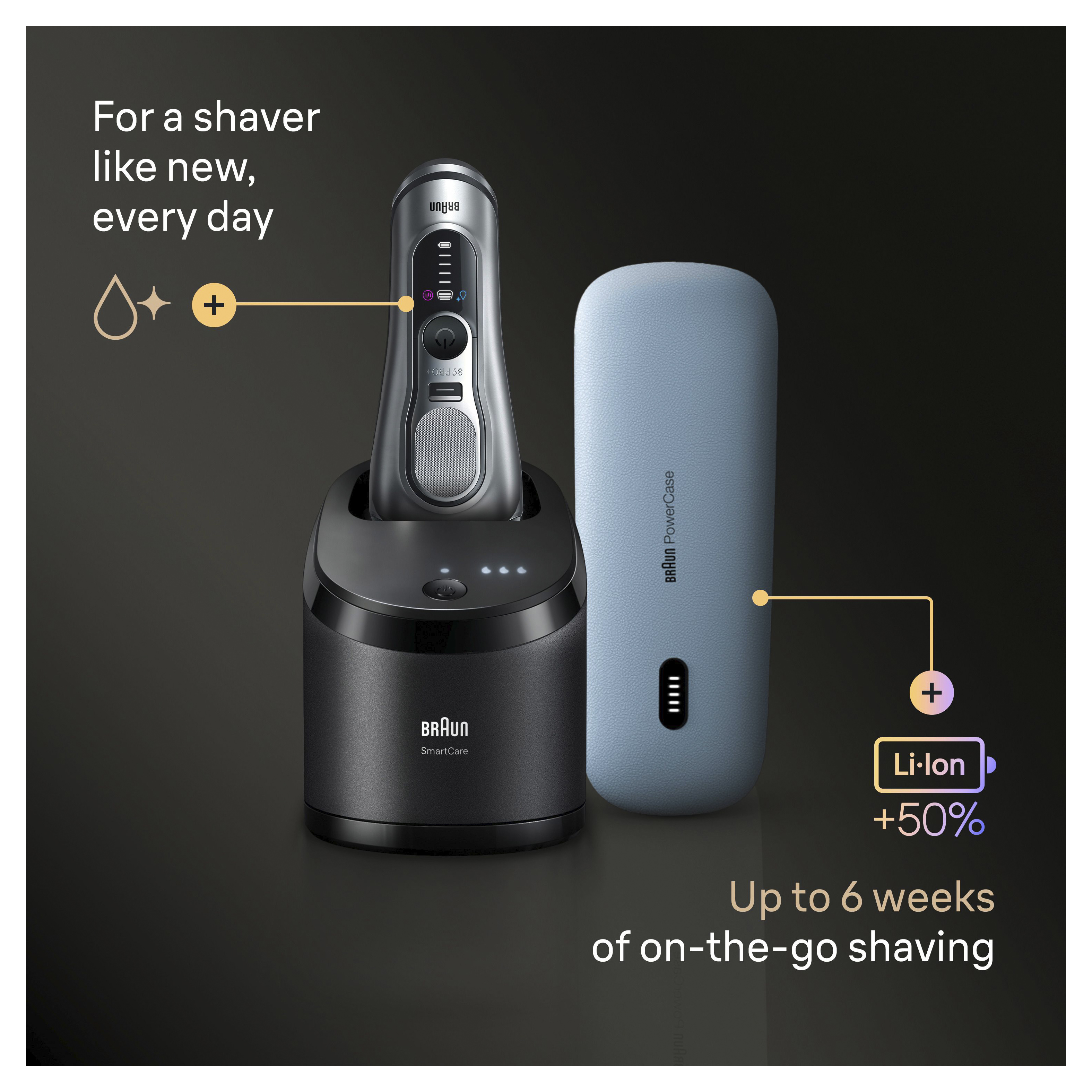 With 5 specialised ProShave elements including the ProLift Blade, the Series 9 PRO+ provides an efficient and gentle shave in every stroke, no matter 1, 3, or 7-day beard. Get ultimate precision thanks to the Precision ProTrimmer enhanced with surgical-grade stainless steel that can perfectly cut even the longest hairs, sideburns and moustache. With 2 premium everyday essentials the 6 in 1 SmartCare center cleans, dries, and charges your shaver for a shaver like new every day & PowerCase for up to 90 minutes of mobile shaving.